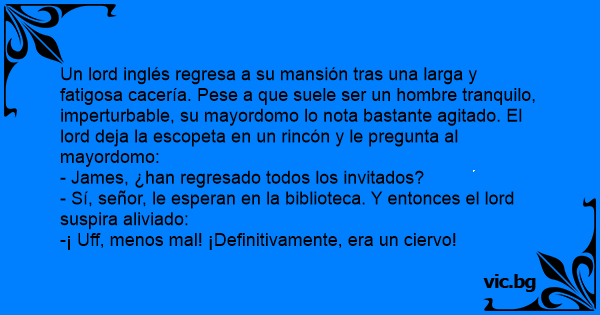 Un lord inglés regresa a su mansión tras una larga y fatigosa cacería. Pese a que suele ser un hombre tranquilo, imperturbable, su mayordomo lo nota bastante agitado. El lord deja la escopeta en un rincón y le pregunta al mayordomo: