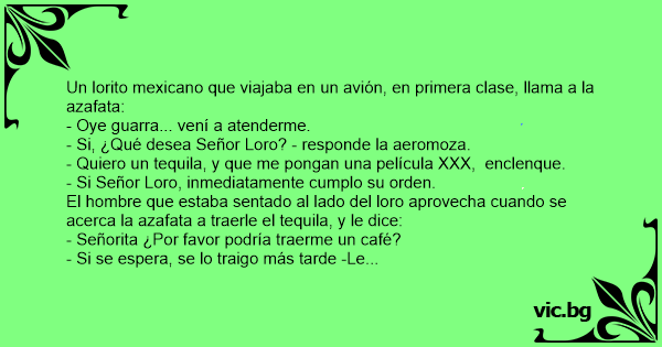 El hombre que estaba sentado al lado del loro aprovecha cuando se acerca la azafata a traerle el tequila, y le dice: