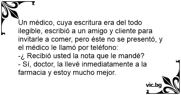 Un médico, cuya escritura era del todo ilegible, escribió a un amigo y cliente para invitarle a comer, pero éste no se presentó, y el médico le llamó por teléfono: