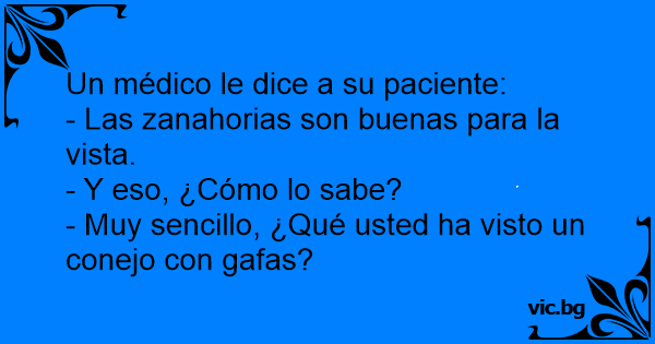 Пацієнт запитує в лікаря: — Лікарю, а правду кажуть, що від моркви зір покращується? — Правду кажуть! Ви коли-небудь бачили зайця в окулярах?