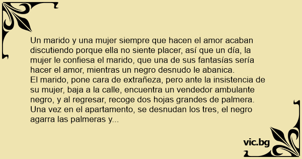 Un marido y una mujer siempre que hacen el amor acaban discutiendo porque ella no siente placer, así que un día, la mujer le confiesa el marido, que una de sus fantasías sería hacer el amor, mientras un nеgrо desnudo le abanica.