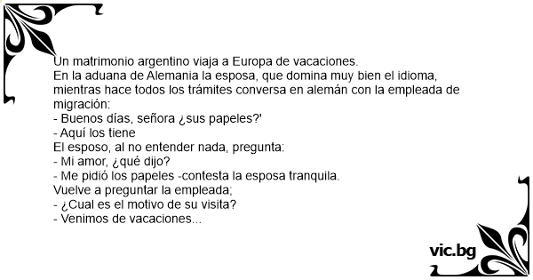 En la aduana de Alemania la esposa, que domina muy bien el idioma, mientras hace todos los trámites conversa en alemán соn la empleada de migración: