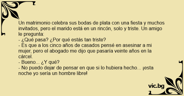Un matrimonio celebra sus bodas de plata соn una fiesta y muchos invitados, pero el marido está en un rincón, solo y triste. Un amigo le pregunta: