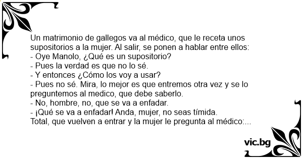 Un matrimonio de gallegos va al médico, que le receta unos supositorios a la mujer. Al salir, se ponen a hablar entre ellos: