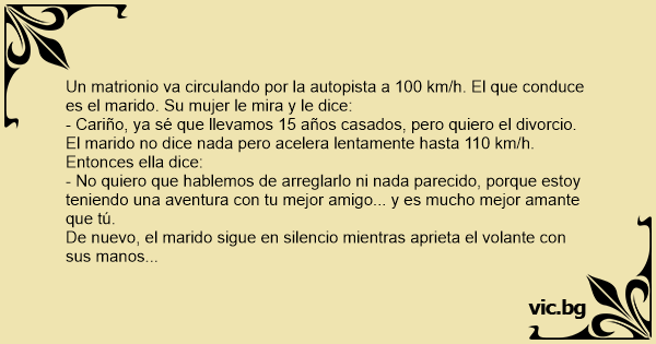 Iba un hombre a 100km y en eso la mujer le dice: - Quiero el divorcio. El hombre acelera a 110km. - Me quiero llevar a los nenes y también la casa entera. El hombre acelera a 120km. - Quiero las...