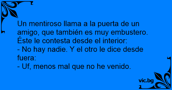 Un mentiroso llama a la puerta de un amigo, que también es muy embustero. Éste le contesta desde el interior: