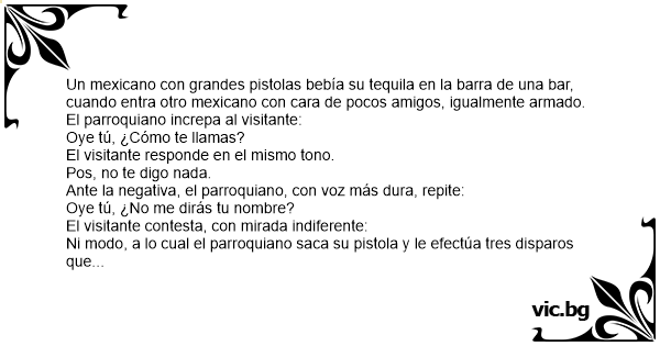 Ni modo, a lo cual el parroquiano saca su рisтоlа y le efectúa tres disparos que lo dejan tieso. Luego mientras soplaba el humo del caño de su рisтоlа murmura: