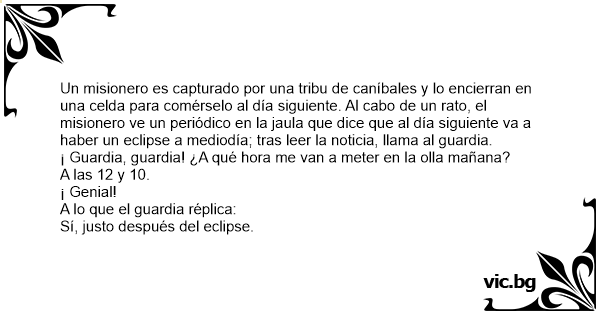 Un misionero es capturado por una tribu de caníbales y lo encierran en una celda para comérselo al día siguiente. Al cabo de un rato, el misionero ve un periódico en la jaula que dice que al día siguiente va a haber un eclipse a mediodía; tras leer la noticia, llama al guardia.