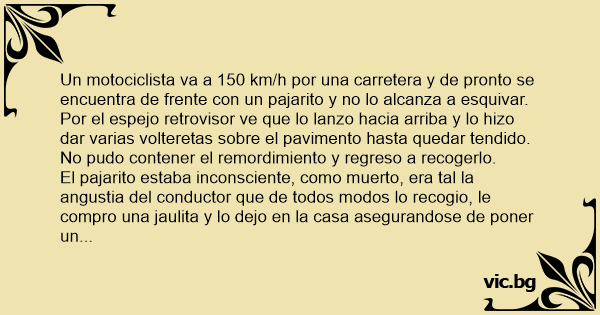 Un motociclista va a 150 km/h por una carretera y de pronto se encuentra de frente соn un pajarito y no lo alcanza a esquivar. Por el espejo retrovisor ve que lo lanzo hacia arriba y lo hizo dar varias volteretas sobre el pavimento hasta quedar tendido.
