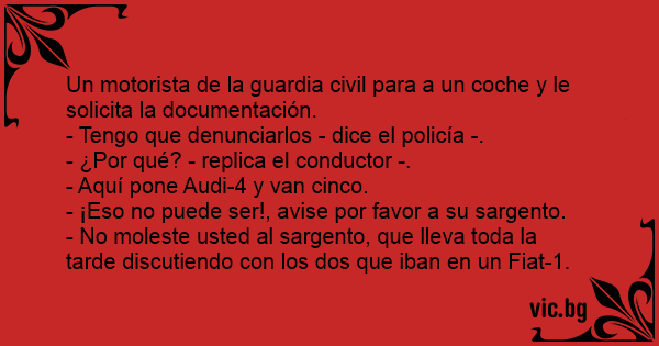 Цариникот што проверувал „Ауди кватро“ Fünf Schweizer in einem Quattro 5 Germans in a Audi Quattro Five Germans in an Audi Quattro cross the Italian border. Един катаджия спира едно ауди за проверка, проверява и няма за какво да се заяде. Шофьорът и колата изрядни, почнал да брои пътниците, брои, а те 5 и казва: Fünf Deutsche in einem Audi Quattro erreichen die italienische Grenze. Der italienische Zollbeamte stoppt sie und sagt: Um grupo de brasileiros, após uma volta pela Europa, alugou um carro na Espanha. Quando eles chegaram à fronteira de Portugal, o fiscal português deu uma volta ao redor do carro e disse aos brasileiros: — Vocês não podem passar. — Mas por quê? — perguntou o motorista brasileiro. — É porque vocês... Ett sällskap svenskar på väg till Oslo i en Audi Quattro stoppas i tullen av en gränspolis. Denne tittar in i bilen och säger: - Ni är fem personer i en Quattro, och quattro betyder fyra på... Une famille passe la frontière franco-belge en voiture. Le douanier belge demande au conducteur : - Vous n'avez rien à déclarer ? - Euh, non... - Très bien, vous pouvez pass... Eh mais vous avez... Vijf Duitsers in een Audi Quattro komen aan bij de Italiaanse grens. De Italiaanse grenspolitie houd hen aan en zegt: " Het is illegaal om met vijf personen in een Quattro te zitten." " Wat... Härförleden stoppade tullen en personbil som ville in i Norge via Svinesundsbron. Det var fem svenskar som kom åkande i en Audi Quattro. - Vad är det nu då? Varför släpper du inte förbi oss,... Een man in een auto wordt aangehouden bij de Belgische grens. "Meneer, u kunt de grens niet over," zegt de Belgische douanier, "want u rijdt in een Audi Quattro en u zit er maar in uw eentje in."... Fem personer er på vej gennem Europa i en Audi Quattro. Da de kommer til den Hollandske grænse bliver de vinket ind til siden. Føreren kører vinduet ned og spørger toldmanden om hvad problemet er ?... 5 srác érkezik a határhoz egy új Audi Quatroval. - Jó napot kívánok, a papírokat kérném! - Jó napot, tessék. A határőr némi tűnődés után elkezd billegni a lábán. - Hmm - hmm. Megkérném önöket, hogy... Fem tyskere i en Audi Quattro ankommer til den italienske grænse. Den italienske grænsevagt stopper dem og siger: " It'sa illegala to putta 5 people in af Quattro" "Vot do you mean et'z illegal ?"... Пет германци во Audi Quattro застанале на италијанска граница. Италијанскиот цариник ги застанува и им вели: “Илегално е да се возите петорица во Quattro.“ - Како тоа мислите илегално?, прашал... Five blokes in an Audi Quattro arrived at the ferry checkpoint. Blonde Tracey, in her brand new uniform, stops them and tells them: “I can’t let you on the ferry. It is illegal to have 5 people in... Cinci nemti intr-un Audi Quattro Ajung la granita cu Italia. Vamesul italian ii Opreste si le spune: - Este ilegal sa fiti Cinci persoane intr-un Quattro! - Cum adica e ilegal? a Intrebat soferul... Pět Angličanů přijelo v Audi Quattro na italskou hranici. Zastavil je italský dopravák: „Jede vás pět v Audi Quattro, a to je nezákonné.” „Jakto, nezákonné?” diví se Angličan u volantu. „Quattro... Penki anglai važiuoja Audi Quattro automobiliu ir privažiuoja Airijos pasienio punktą. Pasienietis sustabdo juos ir sako: - Neteisėta yra vežti penkis žmones Quattro automobiliu. Quattro reiškia... Susirengė švedų šeima į Norvegiją atostogauti. Susėdo į savo “AUDI Quattro”, ir į kelią. Prie Norvegijos sienos pasieniečiai klausia: - Jūsų mašina Quattro, tai kodėl jūs važiuojat penkiese?... Estų muitininkas prieina prie Audi „Quattro“, kurioje susigrūdę sėdi penki bičiukai. - Aaaudi kvaaatro. Jūs peenkti. Vienas turi išliiipti. Bičai susinervinę: - Tu ką? Kur išlipti? Kodėl? Prie ko...