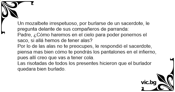 Por lo de las alas no te preocupes, le respondió el sacerdote, piensa mas bien cómo te pondrás los pantalones en el infierno, pues allí creo que vas a tener cola.
