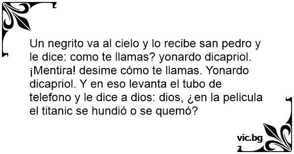 Un negrito va al cielo y lo recibe san pedro y le dice: como te llamas? yonardo dicapriol. ¡Mentira! desime cómo te llamas. Yonardo dicapriol. Y en eso levanta el tubo de telefono y le dice a dios: dios, ¿en la pelicula el titanic se hundió o se quemó?
