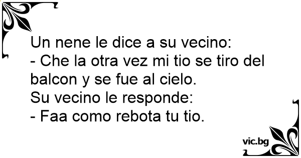 Un nene le dice a su vecino: - Che la otra vez mi tio se tiro del balcon y se fue al cielo. Su vecino le responde: - Faa como rebota tu tio.
