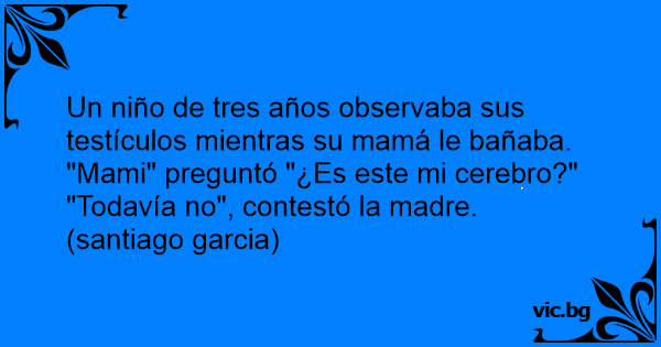 Um menino de cinco anos examinava seus testículos enquanto tomava banho. Ele pergunta à mãe: — Mamãe, isso é meu cérebro? A mãe, responde: — Ainda não meu filho, ainda não…