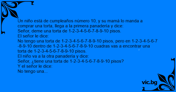 Un niño está de cumpleaños número 10, y su mamá lo manda a comprar una torta, llega a la primera panadería y dice: