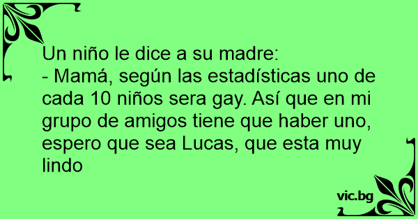 - Mamá, según las estadísticas uno de cada 10 niños sera gаy. Así que en mi grupo de amigos tiene que haber uno, espero que sea Lucas, que esta muy lindo