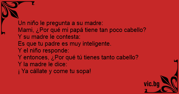Llega un niño y le pregunta a su madre mientras prepara el almuerzo: Mamá, mamá, ¿Por qué mi papá tiene poco cabello? La madre desesperada le responde: Es que tu padre es muy inteligente y piensa...