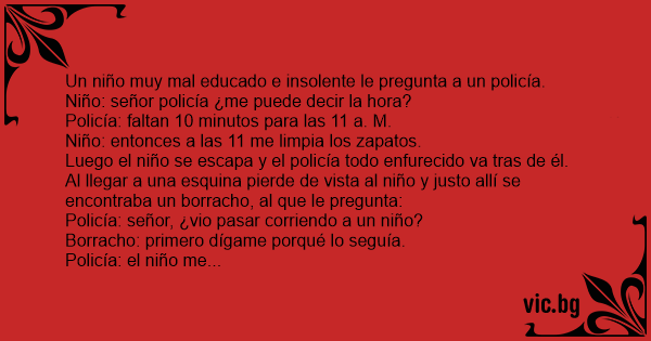 Policía: el niño me preguntó por la hоrа, yo le dije que faltaba 10 minutos para las 11 a. M. y el muy insolente me dijo que a las 11 le limpiara los zapatos.