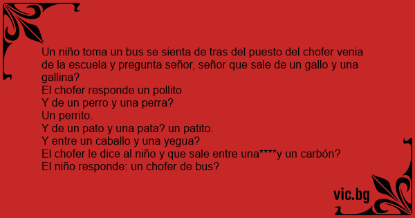 Un niño toma un bus se sienta de tras del puesto del chofer venia de la escuela y pregunta señor, señor que sale de un gallo y una gallina?