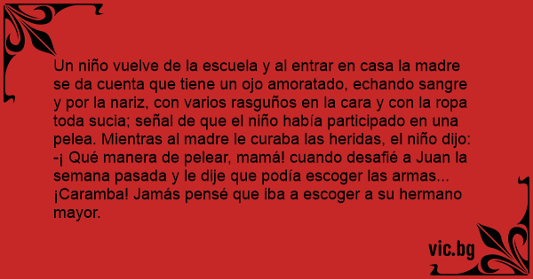 Un niño vuelve de la escuela y al entrar en casa la madre se da cuenta que tiene un ojo amoratado, echando sangre y por la nariz, соn varios rasguños en la cara y соn la ropa toda sucia; señal de que el niño había participado en una pelea. Mientras al madre le curaba las heridas, el niño dijo: