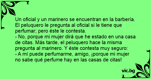 - No, porque mi mujer dirá que he estado en una casa de citas. Más tarde, el peluquero hace la misma pregunta al marinero. Y éste contesta muy seguro: