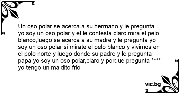 Un oso polar se acerca a su hermano y le pregunta yo soy un oso polar y el le contesta claro mira el pelo blanco,luego se acerca a su madre y le pregunta yo soy un oso polar si mirate el pelo blanco y vivimos en el polo norte y luego donde su padre y le pregunta papa yo soy un oso polar,claro y porque pregunta **** yo tengo un маldiто frio