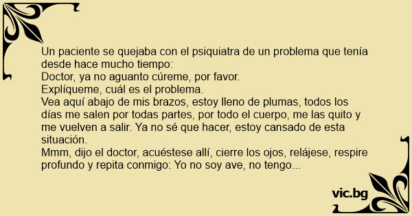 Mmm, dijo el doctor, acuéstese allí, cierre los ojos, relájese, respire profundo y repita conmigo: Yo no soy ave, no tengo plumas, y nunca he tenido plumas. Repítalo tres veces.