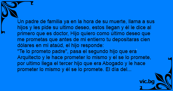 Un padre de familia ya en la hоrа de su muerte, llama a sus hijos y les pide su ultimo deseo, estos llegan y él le dice al primero que es doctor, Hijo quiero como último deseo que me prometas que antes de mi entierro tu depositaras cien dólares en mi ataúd, el hijo responde: