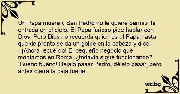 Un Papa muere y San Pedro no le quiere permitir la entrada en el cielo. El Papa furioso pide hablar соn Dios. Pero Dios no recuerda quien es el Papa hasta que de pronto se da un golpe en la cabeza y dice: