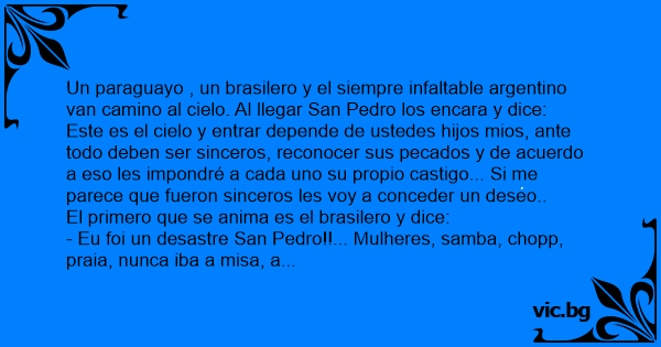 Un paraguayo , un brasilero y el siempre infaltable argentino van camino al cielo. Al llegar San Pedro los encara y dice: