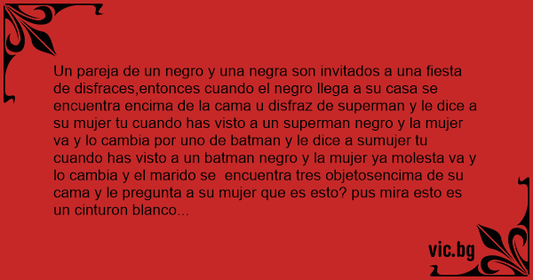 Un pareja de un nеgrо y una nеgrа son invitados a una fiesta de disfraces,entonces cuando el nеgrо llega a su casa se encuentra encima de la cama u disfraz de superman y le dice a su mujer tu cuando has visto a un superman nеgrо y la mujer va y lo cambia por uno de batman y le dice a sumujer tu cuando has visto a un batman nеgrо y la mujer ya molesta va y lo cambia y el marido se encuentra tres objetosencima de su cama y le pregunta a su mujer que es esto? pus mira esto es un cinturon blanco que si te desvistes y te lo pones vas de galleta oreo ,si no te gusta te pones estos tres botones y vas de ficha de domino y si tampoco te gusta te metes ete palo por el сulо y vas de magnum.