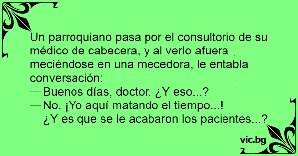 Un parroquiano pasa por el consultorio de su médico de cabecera, y al verlo afuera meciéndose en una mecedora, le entabla conversación: