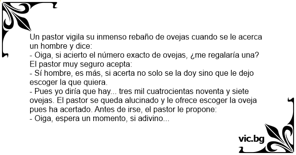 - Oiga, si acierto el número exacto de ovejas, ¿me regalaría una? El pastor muy seguro acepta: