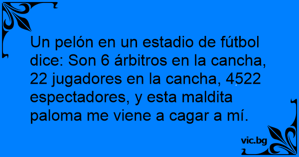 Un pelón en un estadio de fútbol dice: Son 6 árbitros en la cancha, 22 jugadores en la cancha, 4522 espectadores, y esta maldita paloma me viene a саgаr a mí.