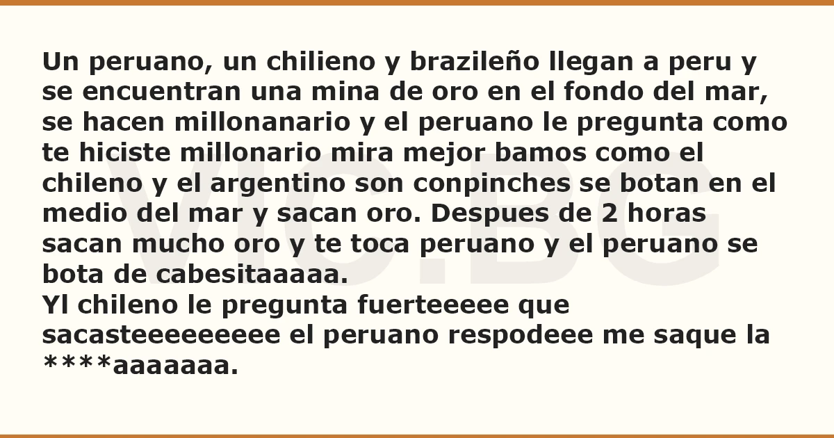 Un peruano, un chilieno y brazileño llegan a peru y se encuentran una mina de oro en el fondo del mar, se hacen millonanario y el peruano le pregunta como te hiciste millonario mira mejor bamos como el chileno y el argentino son conpinches se botan en el medio del mar y sacan oro. Despues de 2 horas sacan mucho oro y te toca peruano y el peruano se bota de cabesitaaaaa. Yl chileno le pregunta fuerteeeee que sacasteeeeeeeee el peruano respodeee me saque la ****aaaaaaa.