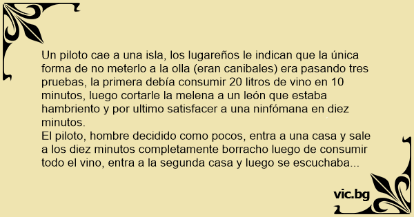Un piloto cae a una isla, los lugareños le indican que la única forma de no meterlo a la olla (eran canibales) era pasando tres pruebas, la primera debía consumir 20 litros de vino en 10 minutos, luego cortarle la melena a un león que estaba hambriento y por ultimo satisfacer a una ninfómana en diez minutos.