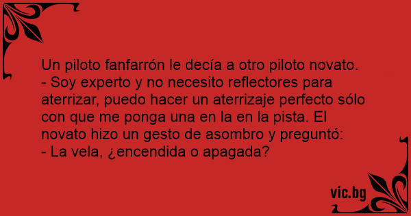 - Soy experto y no necesito reflectores para aterrizar, puedo hacer un aterrizaje perfecto sólo соn que me ponga una en la en la pista. El novato hizo un gesto de asombro y preguntó: