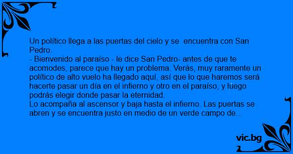 - Bienvenido al paraíso - le dice San Pedro- antes de que te acomodes, parece que hay un problema. Verás, muy raramente un político de alto vuelo ha llegado aquí, así que lo que haremos será hacerte pasar un día en el infierno y otro en el paraíso, y luego podrás elegir donde pasar la eternidad.