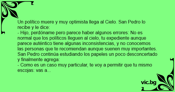 Un político llega a las puertas del cielo y se encuentra con San Pedro - Bienvenido al paraíso - le dice San Pedro- antes de que te acomodes, parece que hay un problema. Verás, muy raramente un...