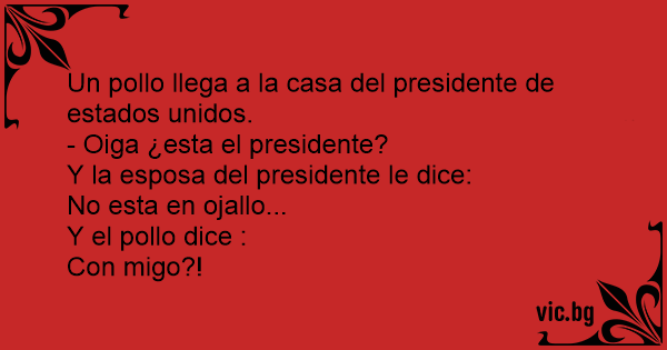 Un pollo llega a la casa del presidente de estados unidos.<br />- Oiga ¿esta el presidente?<br />Y la esposa del presidente le dice:<br />No esta en ojallo...<br />Y el pollo dice :<br />Con migo?!