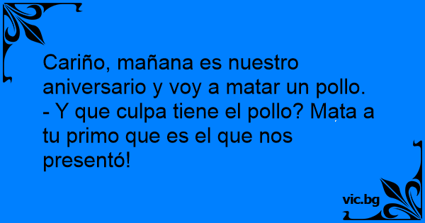 Una vez le dice una mujer a su marido: Mi amor, hoy día estamos de aniversario de matrimonio, por qué no matamos un pollo. Y él le contesta: ¡Que culpa tiene el pollo! ¡Por qué no matamos a tu hermano que fue el que nos presentó!