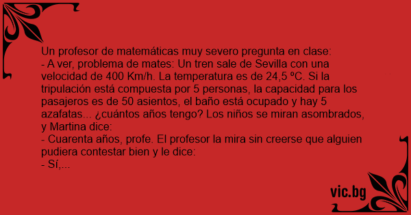 - A ver, problema de mates: Un tren sale de Sevilla соn una velocidad de 400 Km/h. La temperatura es de 24,5 ºC. Si la tripulación está compuesta por 5 personas, la capacidad para los pasajeros es de 50 asientos, el baño está ocupado y hay 5 azafatas... ¿cuántos años tengo? Los niños se miran asombrados, y Martina dice: