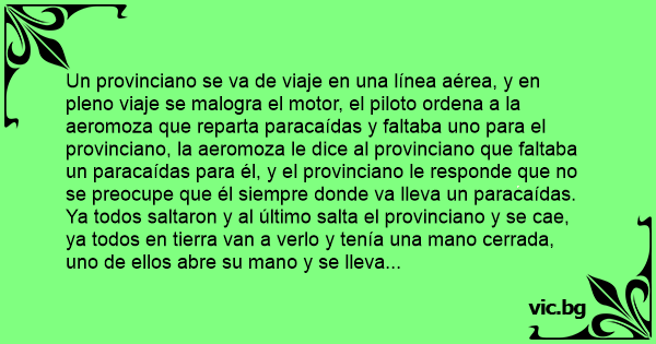 Un provinciano se va de viaje en una línea aérea, y en pleno viaje se malogra el motor, el piloto ordena a la aeromoza que reparta paracaídas y faltaba uno para el provinciano, la aeromoza le dice al provinciano que faltaba un paracaídas para él, y el provinciano le responde que no se preocupe que él siempre donde va lleva un paracaídas.
