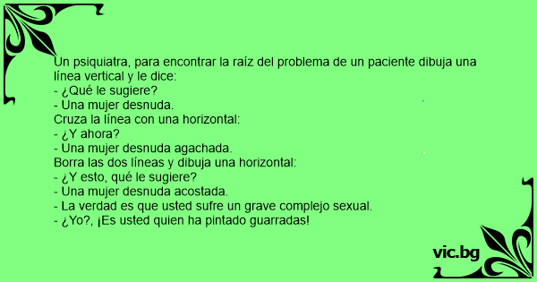 Psikolog karşısındaki sinir hastası bir genci teste tabi tutmaktadır.Kağıt üstüne bir dikdörtgen çizip : -Bu size neyi hatırlatıyor? diye sorar. Hasta : -İçinde kadın bulunan bir yatağı, diye...