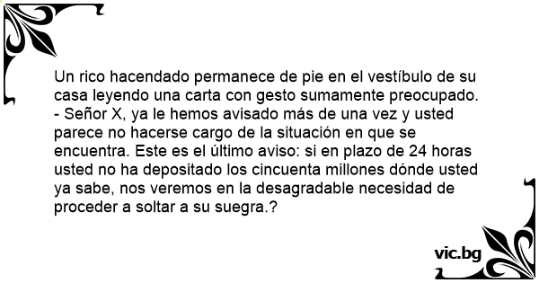 - Señor X, ya le hemos avisado más de una vez y usted parece no hacerse cargo de la situación en que se encuentra. Este es el último aviso: si en plazo de 24 horas usted no ha depositado los cincuenta millones dónde usted ya sabe, nos veremos en la desagradable necesidad de proceder a soltar a su suegra.?