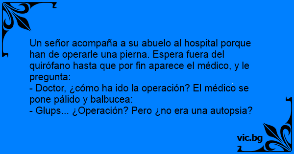Un señor acompaña a su abuelo al hospital porque han de operarle una pierna. Espera fuera del quirófano hasta que por fin aparece el médico, y le pregunta: