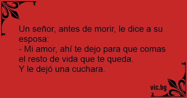 Български English Deutsch Un señor, antes de morir, le dice a su esposa: - Mi amor, ahí te dejo para que comas el resto de vida que te queda. Y le dejó una cuchara. Русский Français Italiano Ελληνικά Македонски Türkçe Українська Português Polski Svenska Nederlands Dansk Norsk Suomi Magyar Româna Čeština Lietuvių Latviešu Hrvatski