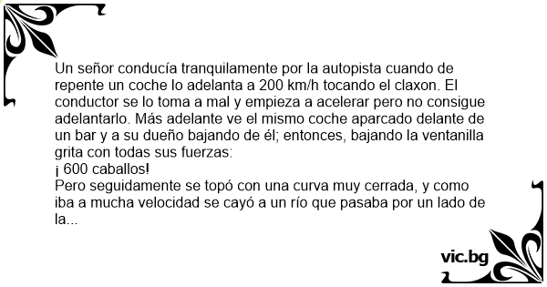 Un señor conducía tranquilamente por la autopista cuando de repente un coche lo adelanta a 200 km/h tocando el claxon. El conductor se lo toma a mal y empieza a acelerar pero no consigue adelantarlo. Más adelante ve el mismo coche aparcado delante de un bar y a su dueño bajando de él; entonces, bajando la ventanilla grita соn todas sus fuerzas: