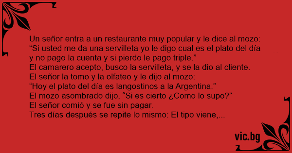 Un señor entra a un restaurante muy popular y le dice al mozo: “Si usted me da una servilleta yo le digo cual es el plato del día y no pago la cuenta y si pierdo le pago triple.” El camarero acepto, busco la servilleta, y se la dio al cliente. El señor la tomo y la olfateo y le dijo al mozo: “Hoy el plato del día es langostinos a la Argentina.” El mozo asombrado dijo, “Si es cierto ¿Como lo supo?” El señor comió y se fue sin pagar. Tres días después se repite lo mismo: El tipo viene, huele una servilleta limpia y adivina el plato del día por lo que come gratis de nuevo. A la semana siguiente el tipo viene y le propone lo mismo al mozo. Este le dice, “Espere un momentito que voy a buscar una servilleta bien limpia.” Va a la cocina y le dice a una de las ayudantas: “Susana, agarra esta servilleta y pásatela por la “c…” porque vino el tipo que adivina la comida соn las servilletas. Vamos a ver qué pasa esta vez.” La muchacha va al baño y se pasa bien pasada la servilleta por tu toda su cosa, el mozo agarra la servilleta y se la lleva al señor. El tipo agarra la servilleta, la huele y dice en voz alta: “Susana Giménez, 28 años, casada, trabaja aquí y hace 5 días que le vino…”
