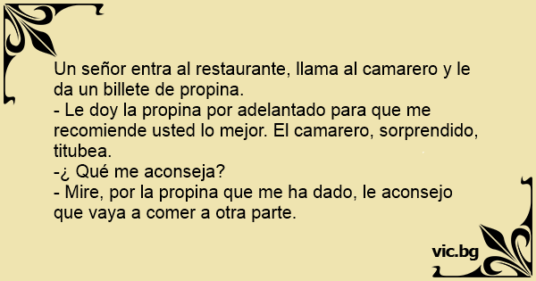 - Le doy la propina por adelantado para que me recomiende usted lo mejor. El camarero, sorprendido, titubea.